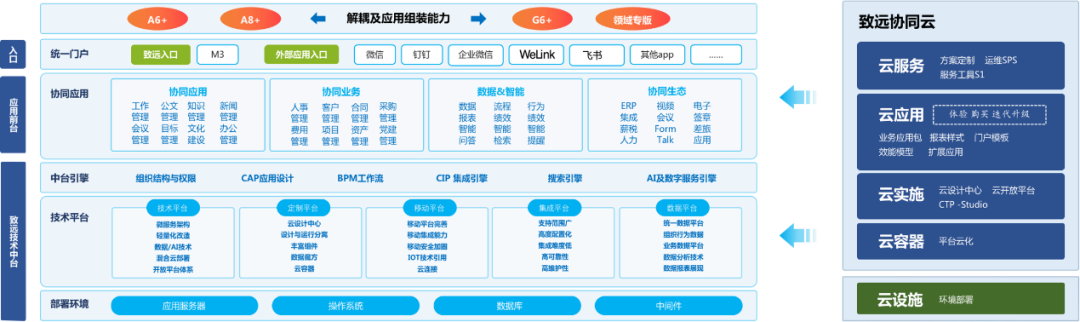 致远软件COP作为智慧型协同运营中台,汇聚产品及平台的力量、技术的力量和云服务的力量,构建起强大的中台能力,全面支撑企业数字化创新。