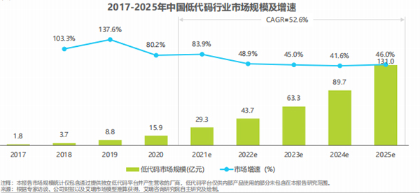 据艾瑞咨询预测,低代码普及是行业大势所趋,随着越来越多的应用场景被挖掘,未来5年,低代码整体将维持50%以上的复合增长。