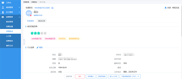 薪事力平台的招聘管理可以对接主流招聘网站,支持一键发布职位,同时结合企业实际招聘业务流程,可以自动生成企业招聘官网,可应用在微信、社交平台招聘,内推等多种场景,实现招聘信息的统一管理,避免了人力对接不同平台的重复性、低效率工作,同时集成了各行业丰富的职位库,可快速形成待招职位信息,高精度简历解析,匹配打分,自动高效筛选合适的候选人,节约人力资源部门简历筛选的时间,提升人才与岗位匹配的精准度,降低简历的筛选成本,提升人才匹配效率。