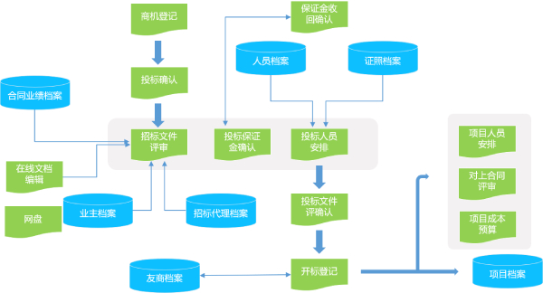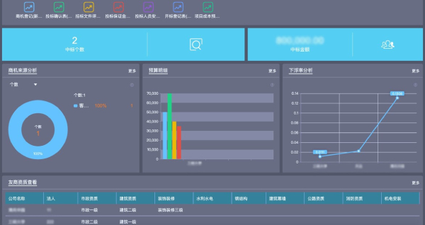 经营管理平台可以实现对商机投标的全过程管理,包括商机研判与投标确认、投标文件评审与保证金确认,投标人员安排与开标过程、中标信息登记等流程,实现投标管理流程化、可视化与投标过程的实时跟踪。