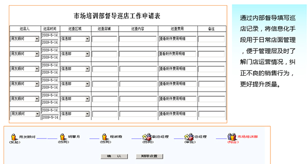 6.店面装修申请:零售行业直接面向终端消费者,厂商直营店面的装修形象非常重要。定期装修店面,提升品牌形象能更好的吸引人气,促进销量。通过装修申请向厂商总部说明现在门店状况、装修原因、装修规模、预算、耗时等信息,由总部评估并审核。